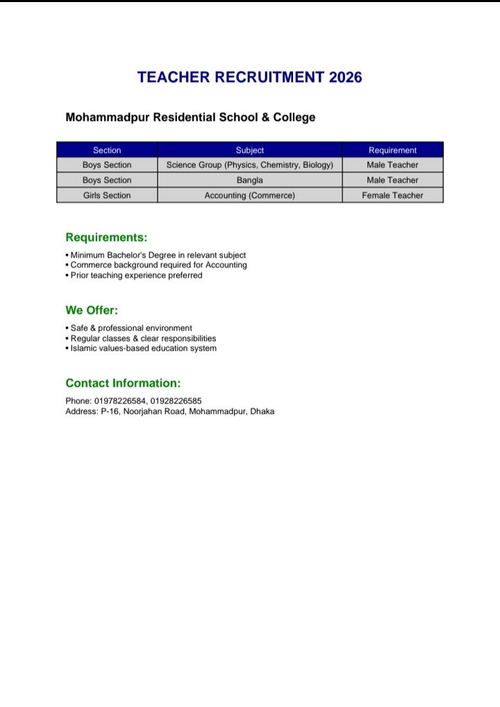 Title Mohammadpur Residential School & College-এ ২০২৬ শিক্ষাবর্ষে শিক্ষক নিয়োগ চলছে। Science, Bangla ও Accounting বিষয়ে অভিজ্ঞ শিক্ষক/শিক্ষিকা প্রয়োজন।